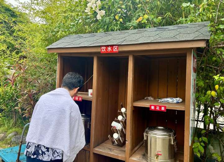 室外休息区的长桌上,保温茶桶始终充盈——一边是驱寒暖胃的姜茶,一边是解腻清爽的凉茶,适配不同游客的偏好。